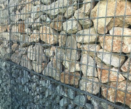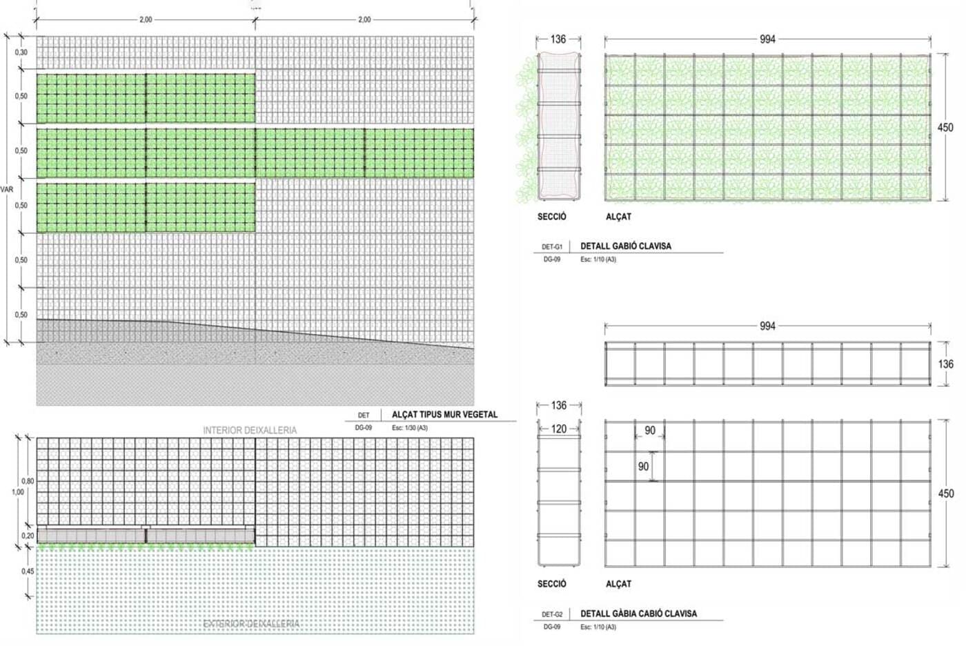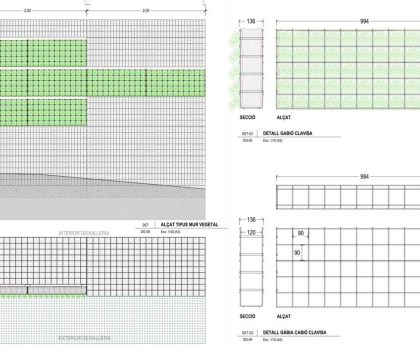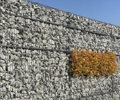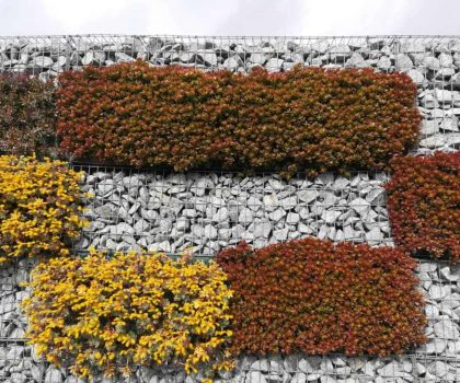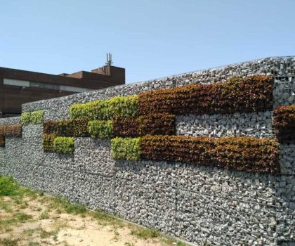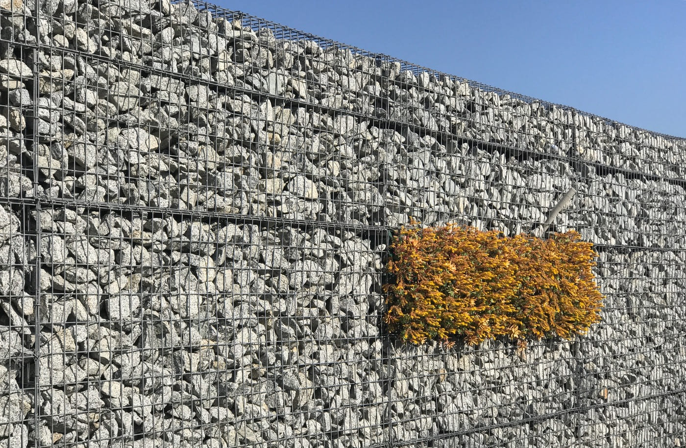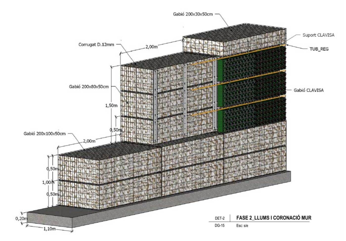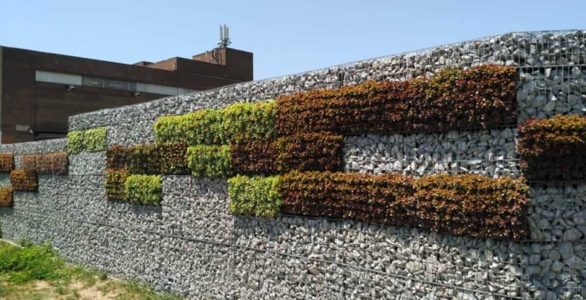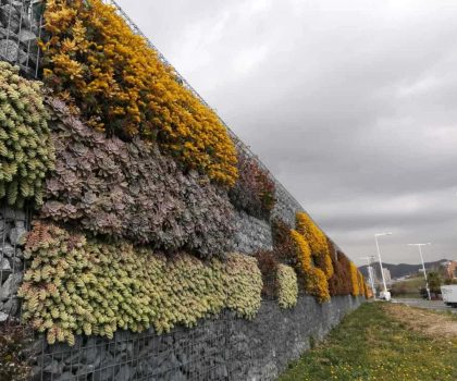 - Descripció Convertim una antiga tanca, en un mur de gabions , vegetada amb planta crassa , que té molt baix manteniment. Es crea un mosaic de rectangles de diferents colors i textures.