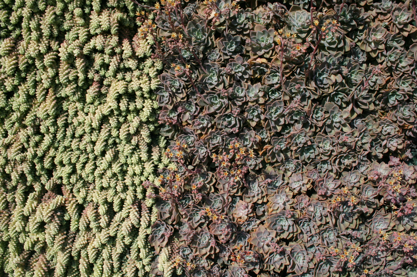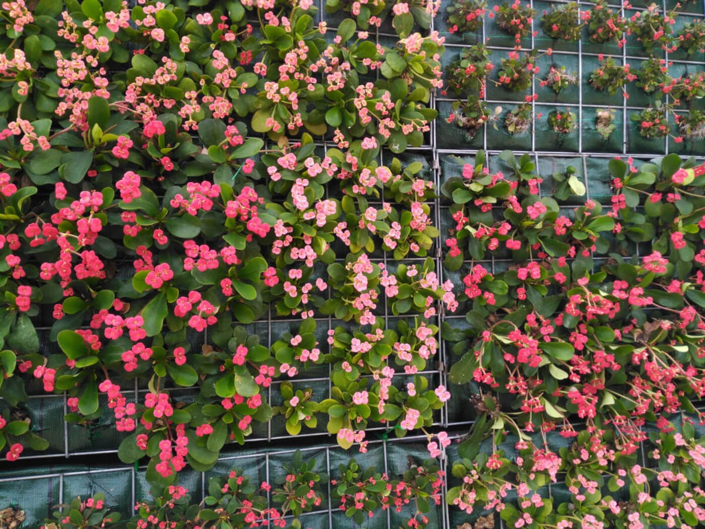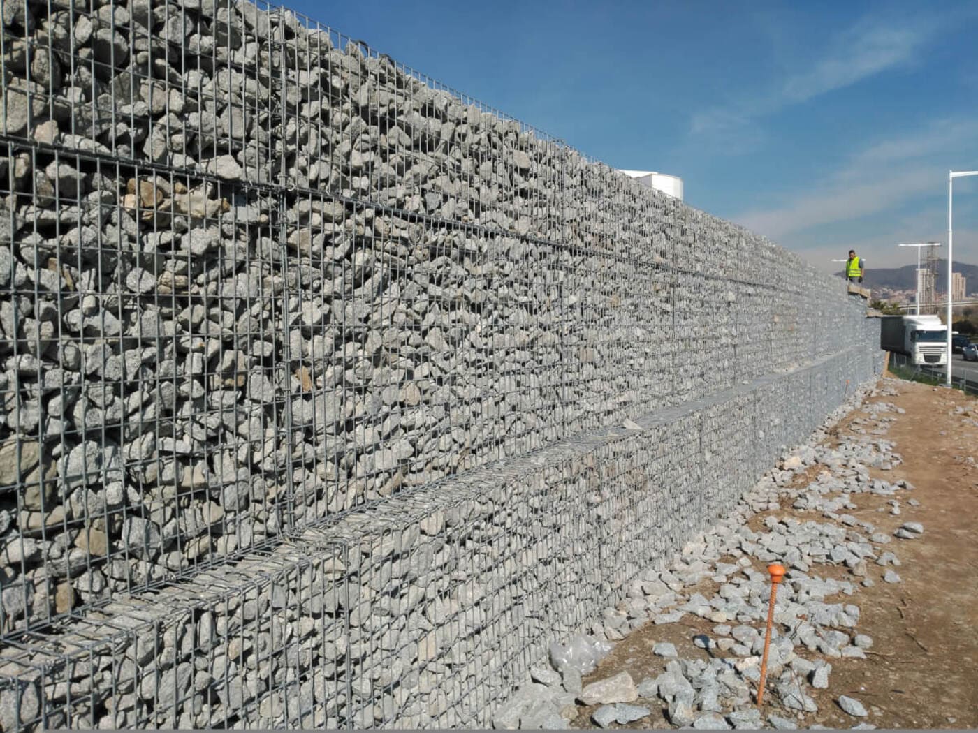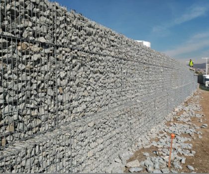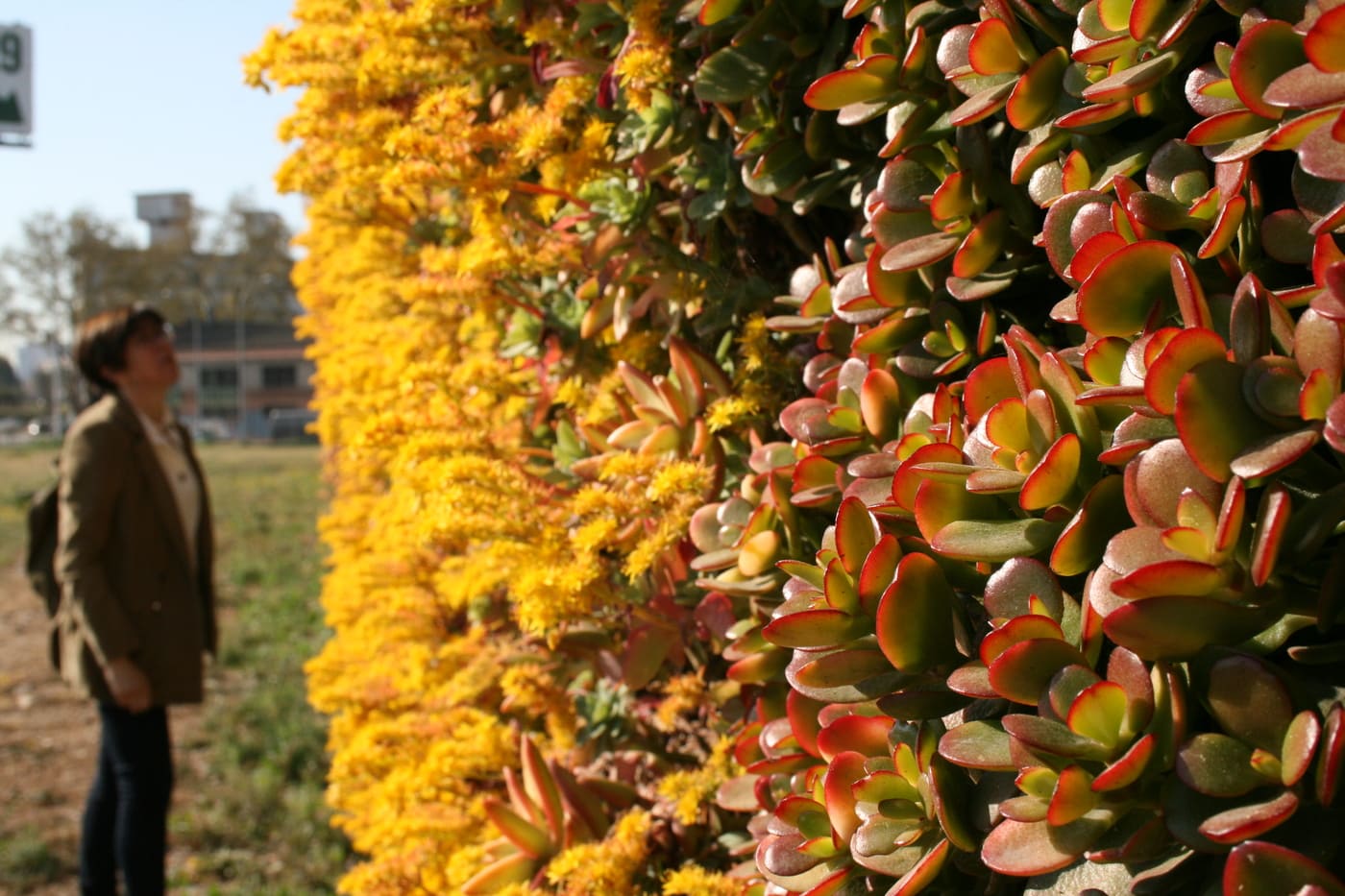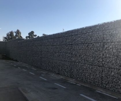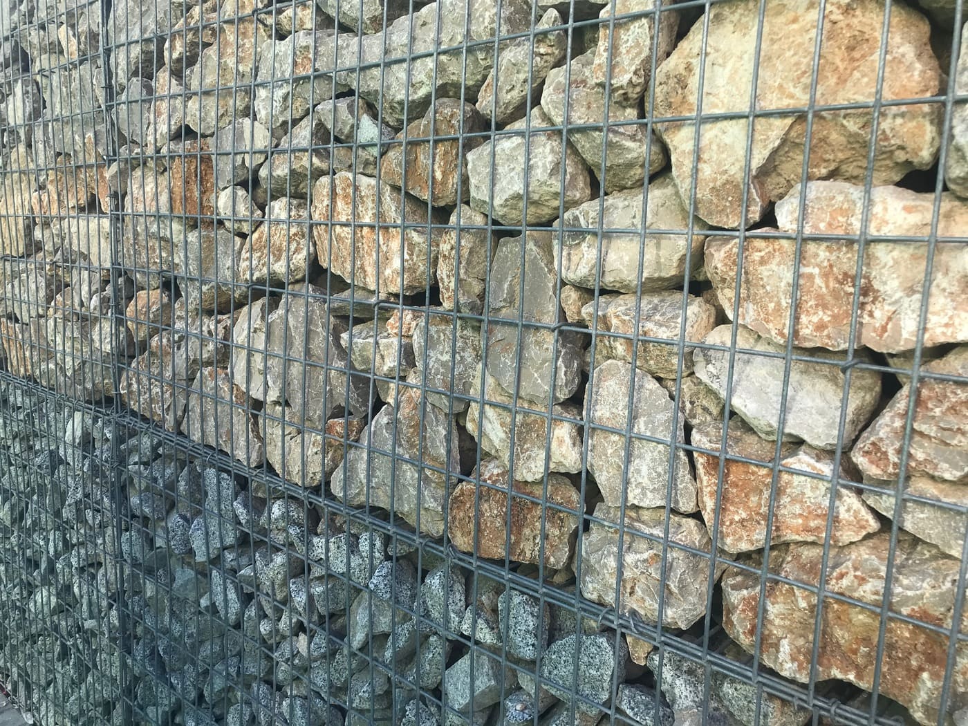 - Descripció Convertim una antiga tanca, en un mur de gabions , vegetada amb planta crassa , que té molt baix manteniment. Es crea un mosaic de rectangles de diferents colors i textures.