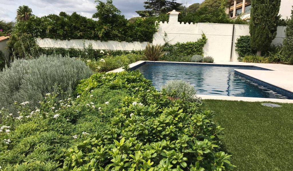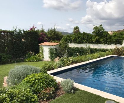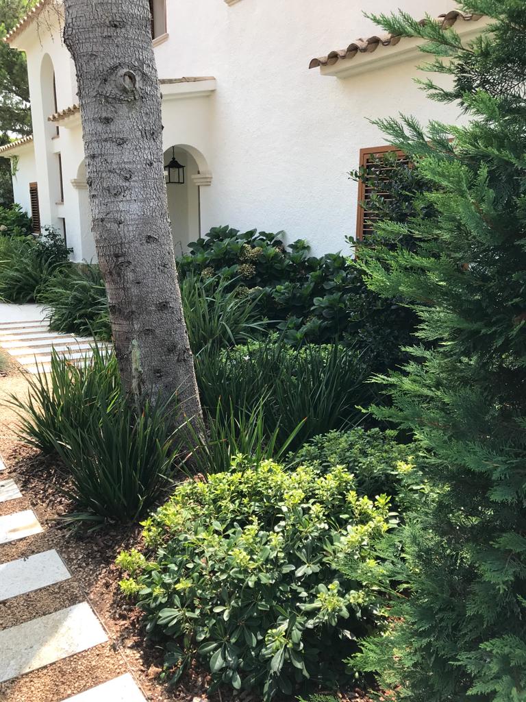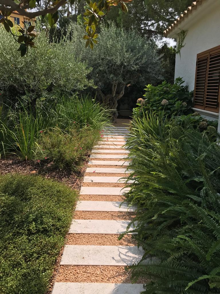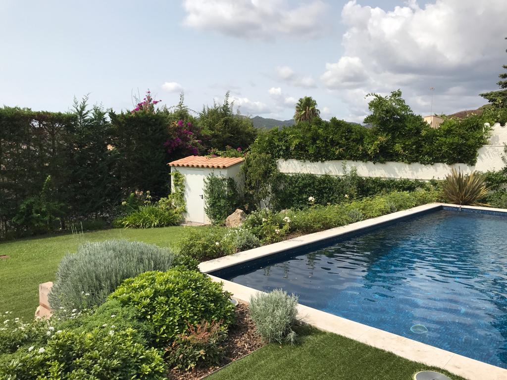 • Descripció Enjardinament amb modificació del terreny en dues terrasses, una més propera amb la piscina i una altra com a zona d’estada.