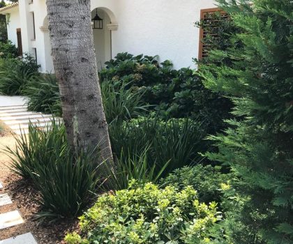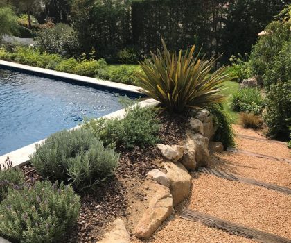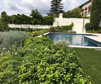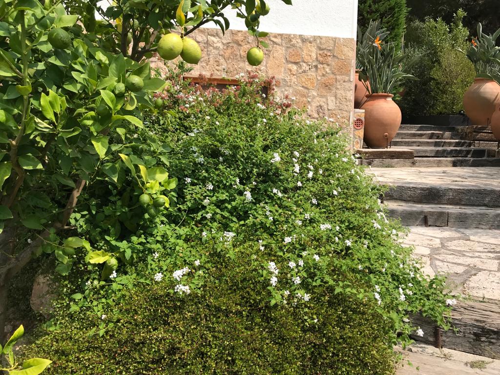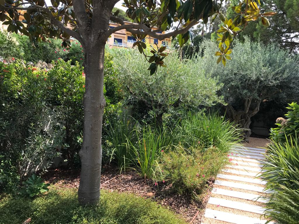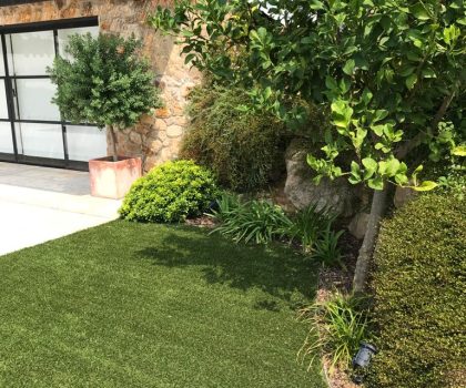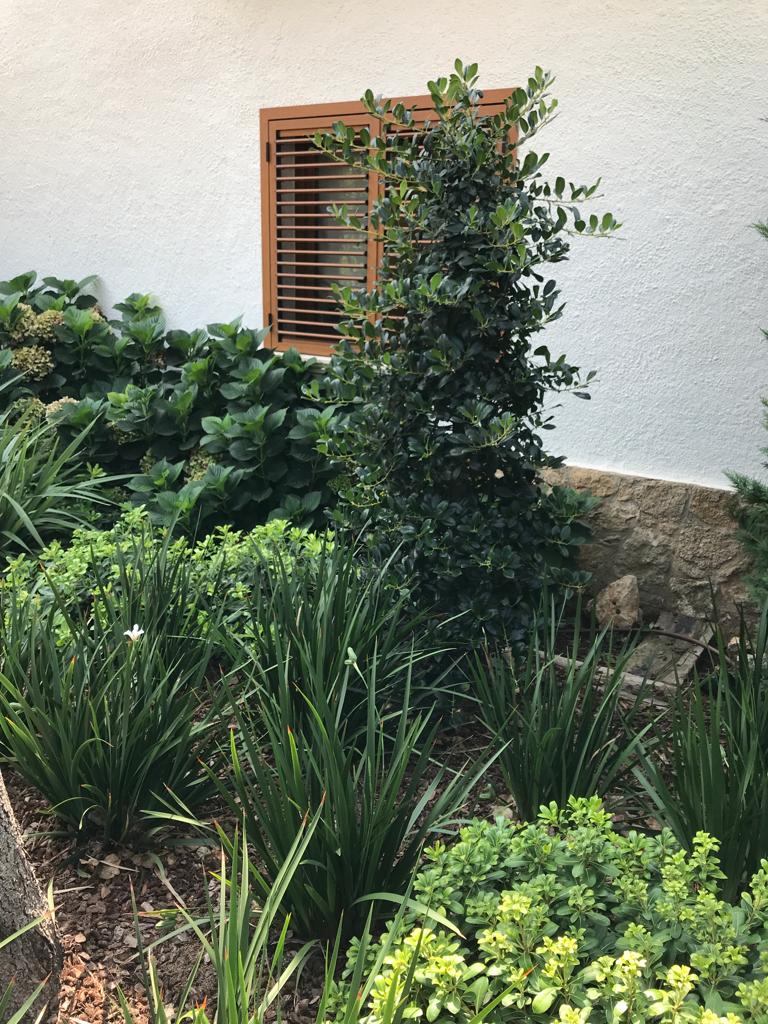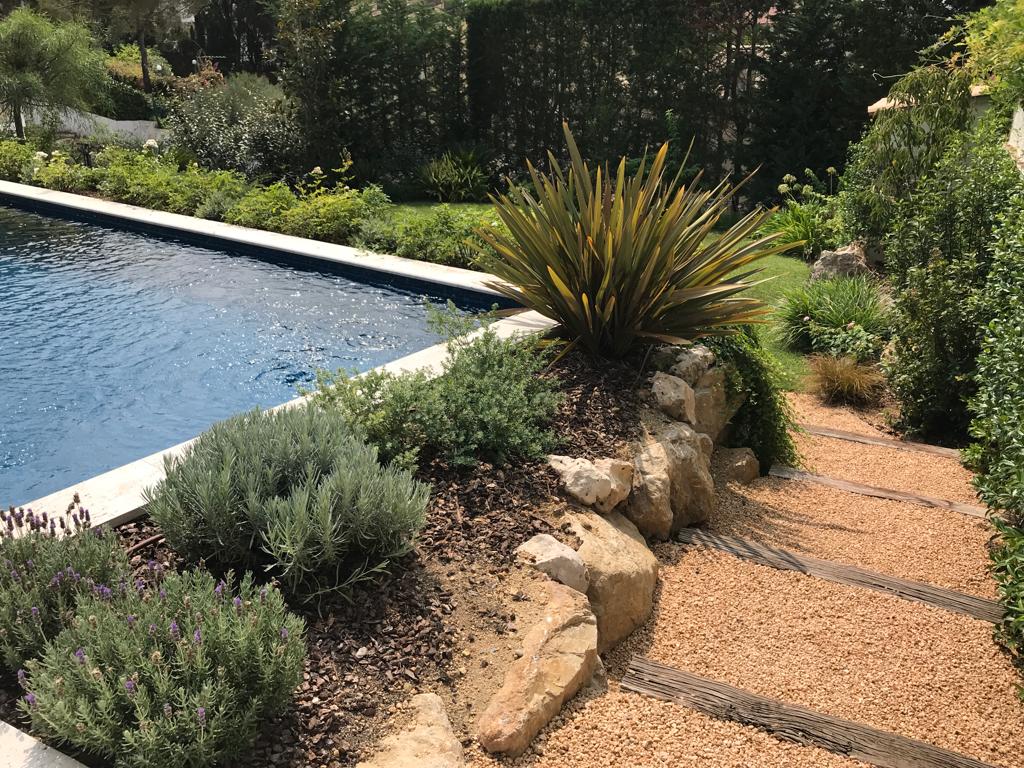 • Descripció Enjardinament amb modificació del terreny en dues terrasses, una més propera amb la piscina i una altra com a zona d’estada.